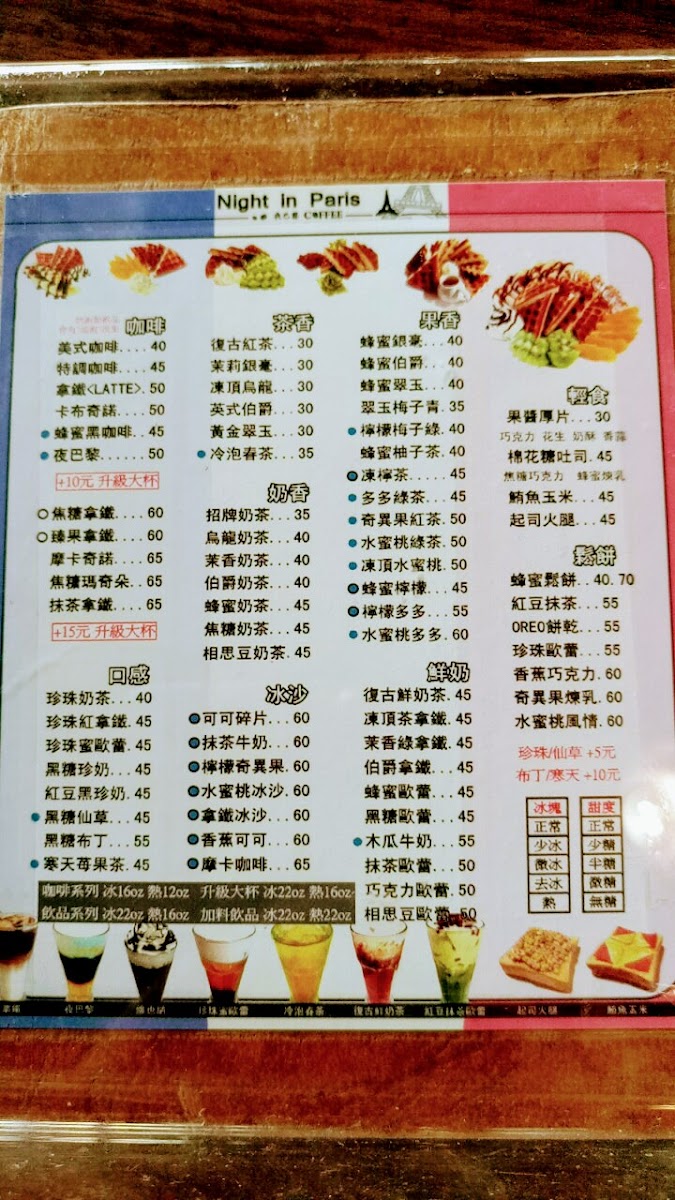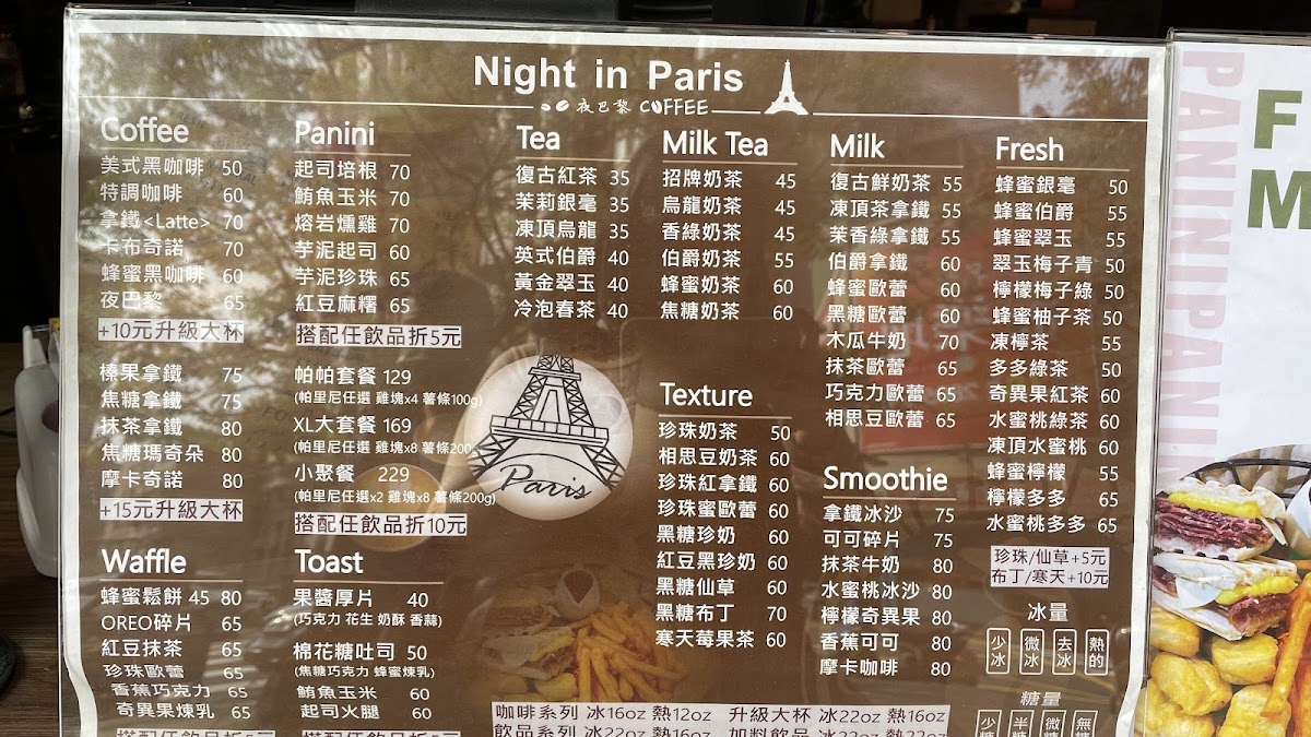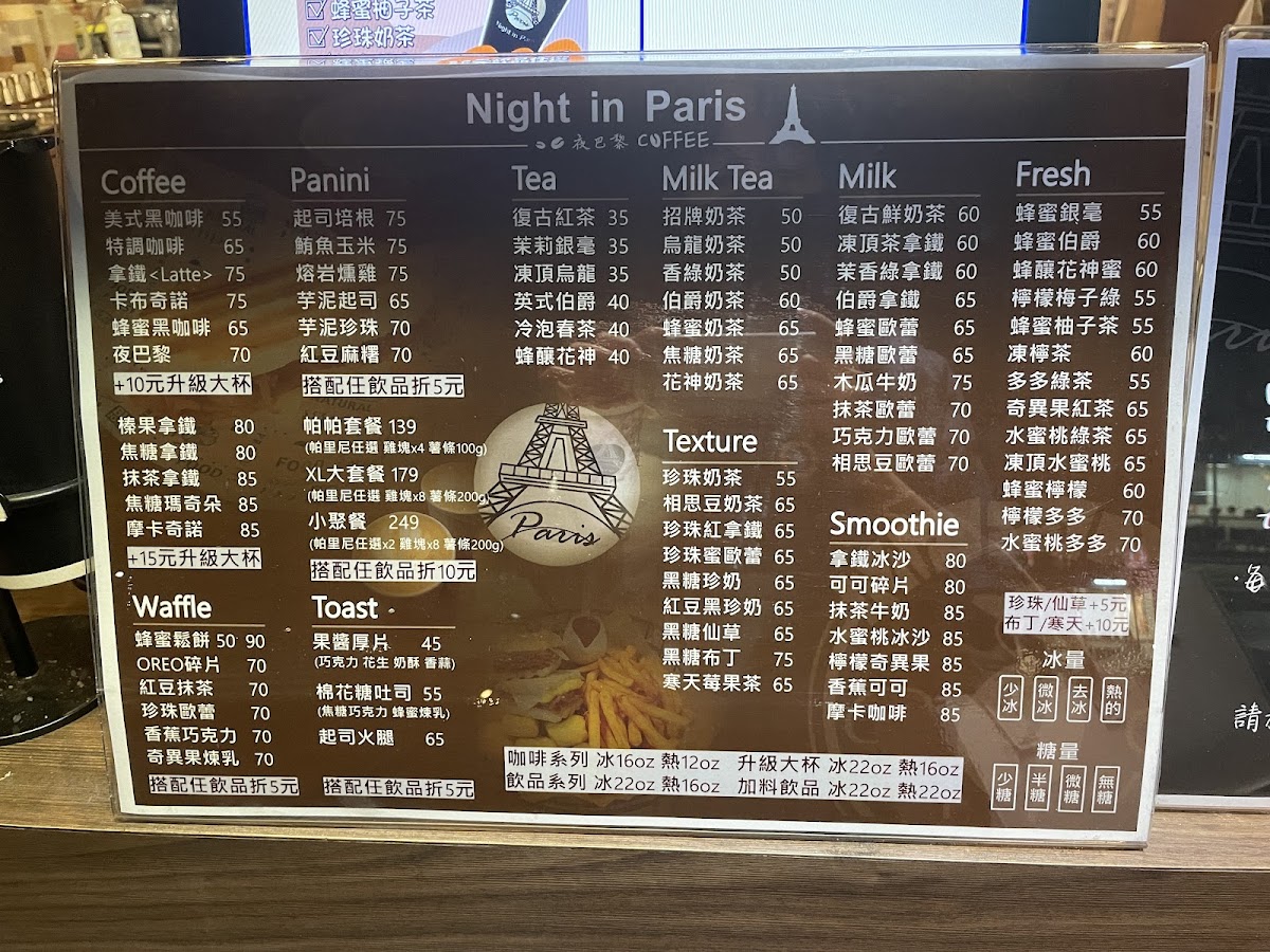 Night in Paris offers a modest yet captivating menu that features their popular 抹茶牛奶 (Matcha Milk Shake) at NT$91.00 and OREO餅乾鬆餅 (Oreo Waffles) priced at NT$76.00. Imagine sipping on the creamy, refreshingly sweet Matcha Milk Shake—each sip is like a soothing embrace on a humid day, perfectly balancing rich flavors and velvety texture. And then there are the Oreo Waffles, which are not just a treat for your taste buds but also a delightful visual feast as they are served golden-brown and topped with a luscious drizzle of chocolate.